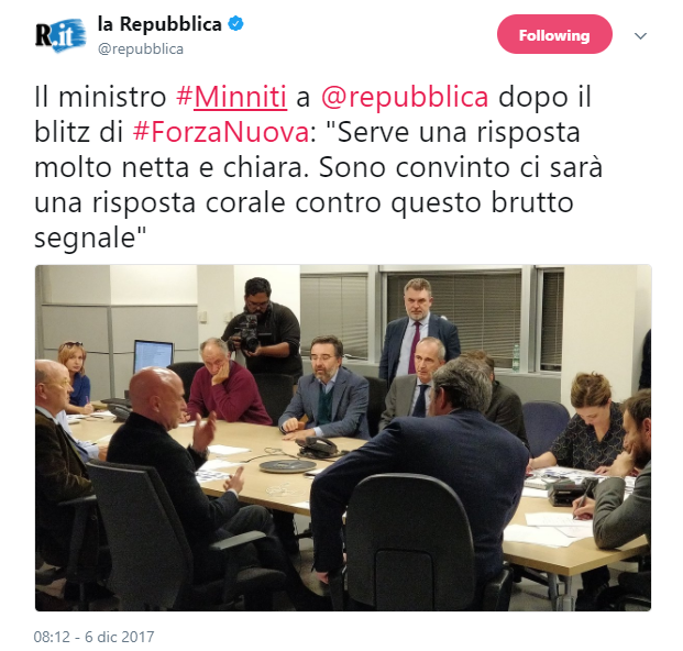 Questo dovrebbe essere, secondo i militanti, solo uno di una serie di atti. La minaccia è confermata dal leader Roberto Fiore su Facebook: “Primo atto di una guerra politica al Gruppo Espresso e al Pd“. Uno dei militanti è stato fermato e denunciato. Intanto il ministro dell’interno Marco Minniti si è recato al giornale per esprimere il proprio disappunto sulla vicenda.