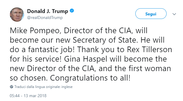 Rivoluzione in un tweet. Donald Trump annuncia il passaggio di testimone alla Casa Bianca fra Rex Tillerson e Mike Pompeo su Twitter. L’ex direttore della Cia – nominato dallo stesso presidente nel gennaio 2017 – sarà il nuovo segretario di Stato. Secondo il Washington Post, il presidente Usa aveva chiesto a Tillerson di farsi da parte venerdì scorso, costringendolo ad accorciare il suo viaggio in Africa. Oggi la conferma definitiva direttamente dal tycoon: “Ho deciso da solo, ora Tillerson sarà più felice”. Al posto di Pompeo a capo della Cia, arriva invece Gina Haspel, sua numero due e soprattutto prima donna a ricoprire la massima posizione nell’agenzia.