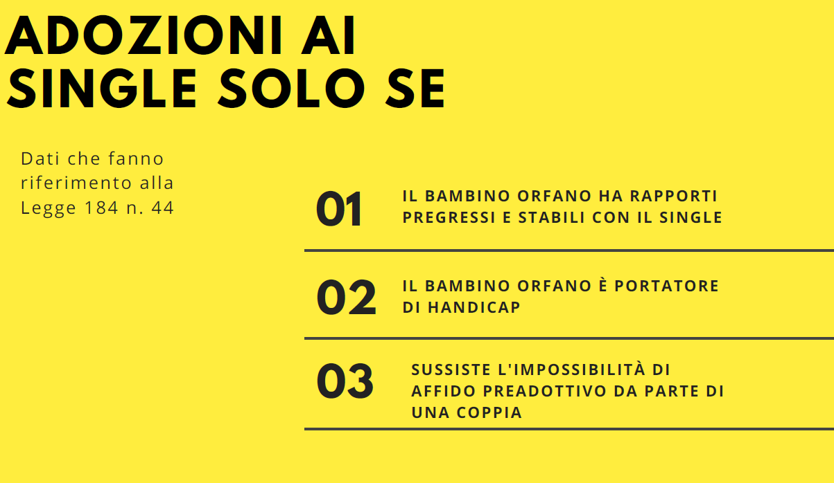 Sempre nell’articolo 44 si legge che adottare, per i single, è possibile solo nei casi di rapporti stabili e duraturi tra chi vuole adottare e il bambino, in caso di grave disabilità del minore e nel caso sussista l’impossibilità di un affidamento preadottivo da parte di una coppia.