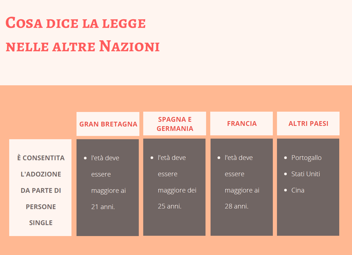 L’estero. Molti italiani, per ovviare al problema, decidono di andare all’estero, dove l’iter legislativo è più semplice. Nei paesi dell’Unione europea come la Francia, la Gran Bretagna, la Spagna e la Germania è consentita l’adozione da parte di single che abbiano un’età maggiore dei 30 anni.