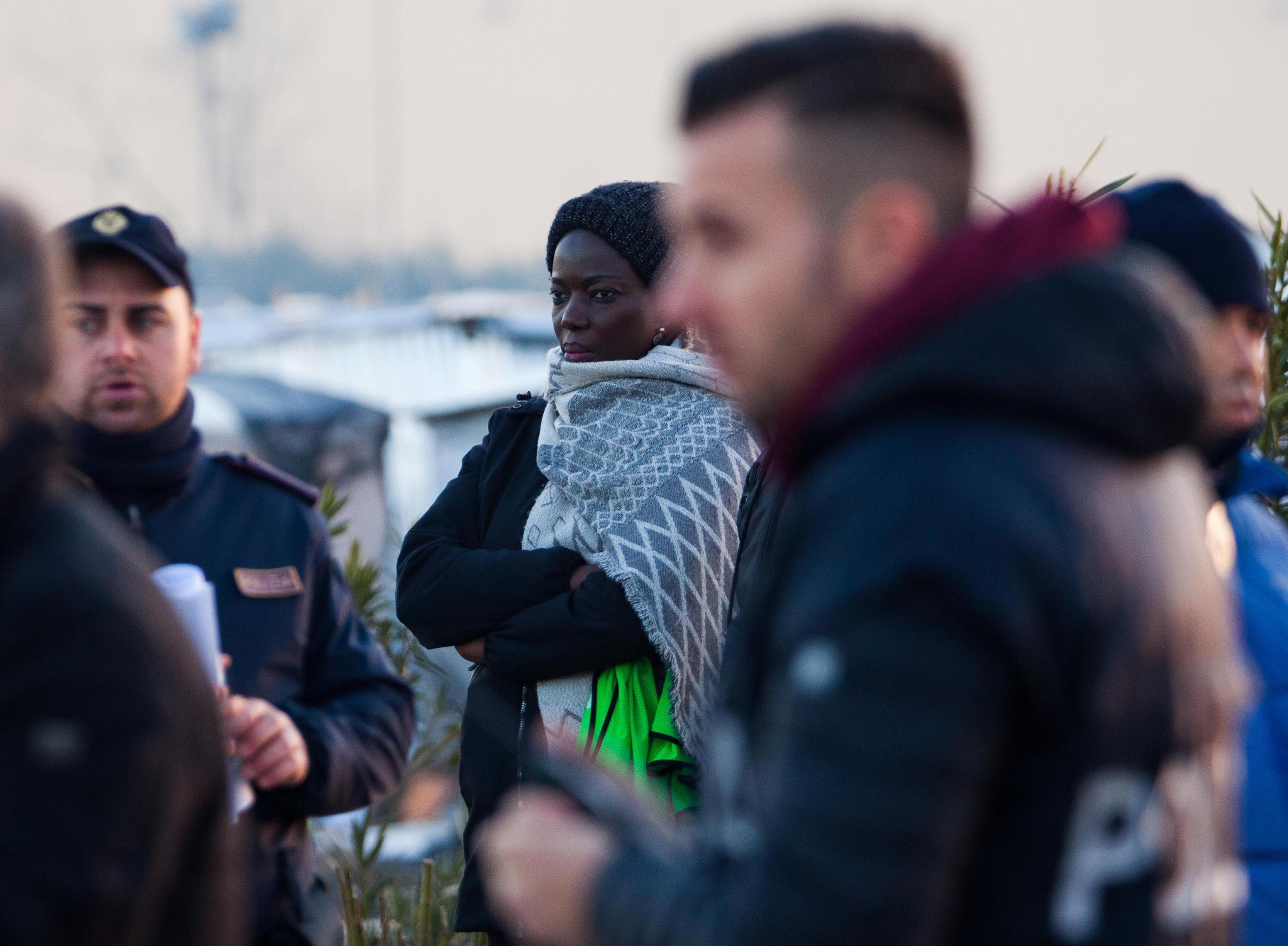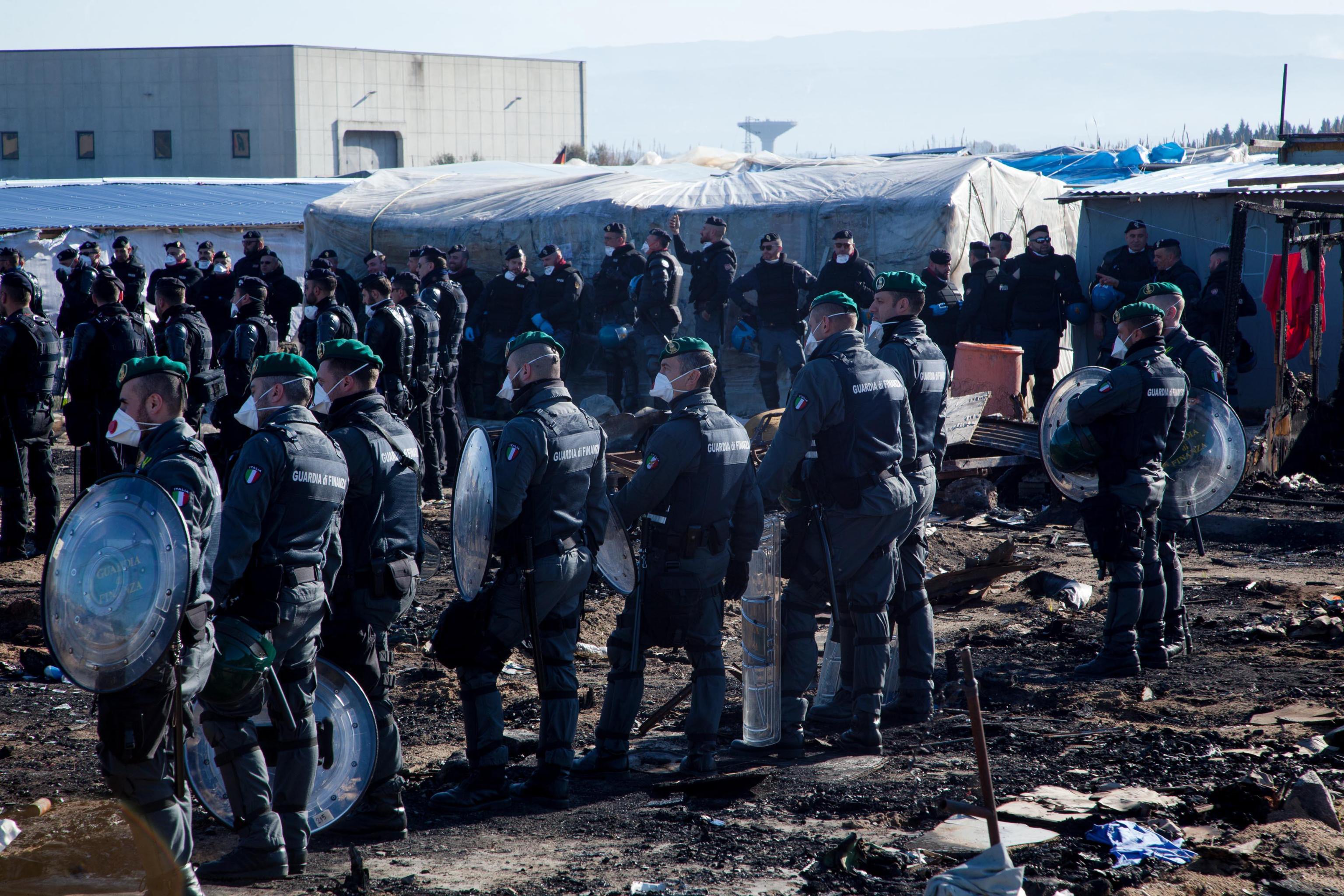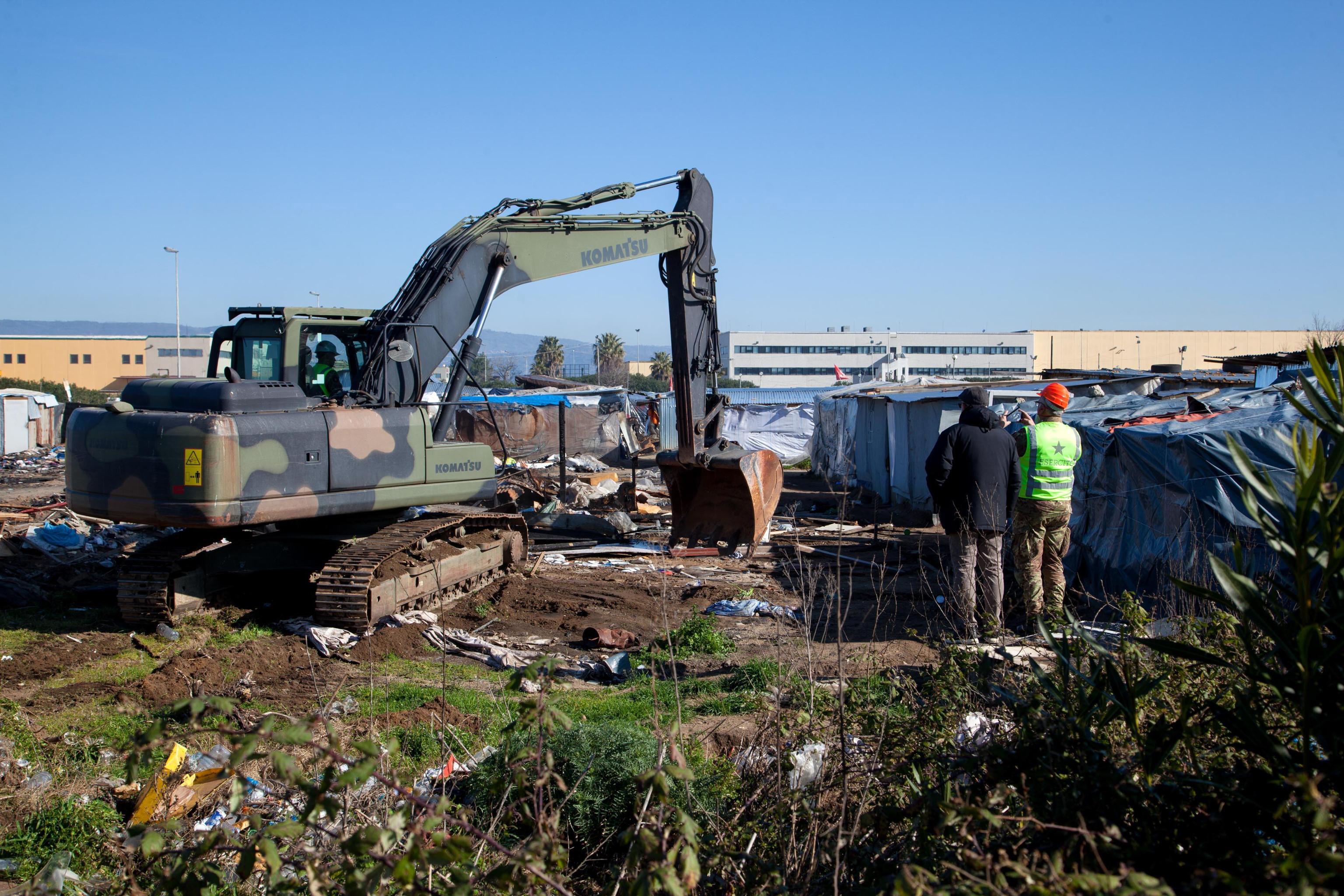 Per l’operazione sono stati impiegati 600 uomini, tra forze dell’ordine, Vigili del Fuoco, servizi sanitari e due elicotteri. Davanti la baraccopoli i migranti osservano le due ruspe e i due escavatori dell’Esercito in azione mentre demoliscono quelle che erano la loro case fino alla notte scorsa.