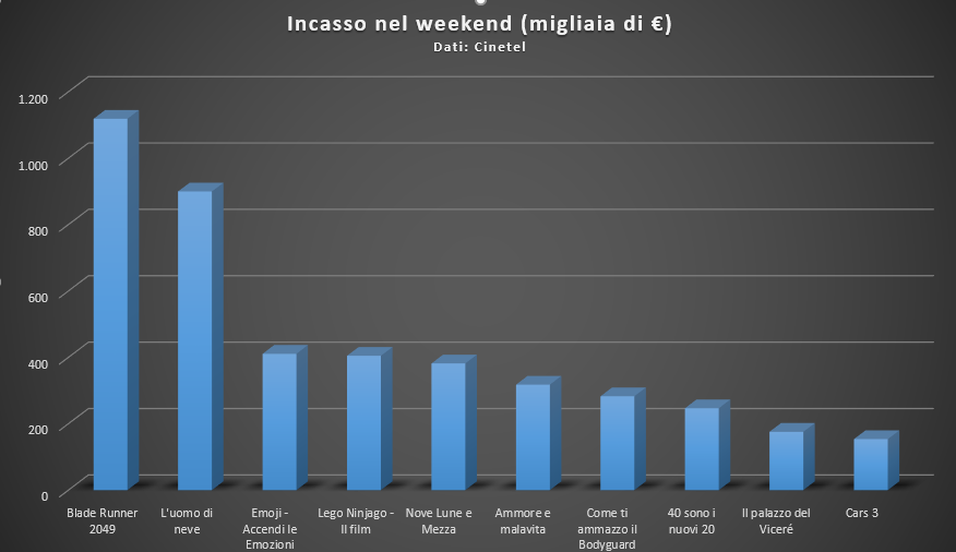 Nel periodo in cui Blade Runner 2049 continua ad essere il film più visto (guadagnando 3.819.037 euro in due settimane di programmazione), il calo degli spettatori (-34% rispetto al weekend precedente) può essere addebitato alla programmazione o alle pellicole che non attraggono a sufficienza gli spettatori. A sostenerlo Andrea Occhipinti, fondatore della casa di produzione e distribuzione Lucky Red e presidente dei distributori dell’Anica (l’Associazione Nazionale Industrie Cinematografiche), indica la qualità dei film come il principale motivo della crisi.