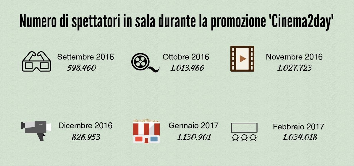 I NUMERI. Risultati così sorprendenti non si ottenevano da tempo. Cinema2day, infatti, ha fatto registrare un numero di presenze superiore alla media. A settembre – primo mese dell’iniziativa – 598.460 spettatori si sono recati al cinema, così come ad ottobre, dove sono stati addirittura 1.013.466. All’appuntamento di novembre hanno risposto 1.027.723 persone, mentre a dicembre 826.953. Con l’arrivo del nuovo anno, poi, il pubblico si è attestato attorno a 1.130.901 presenze, diminuendo leggermente a febbraio (1.034.018 spettatori). Per quanto riguarda gli incassi, invece, l’acme si è registrata a gennaio con 2,3 milioni di euro, ma anche ad ottobre, novembre e febbraio la soglia raggiunta è stata di oltre due milioni di entrate. Infine, settembre ha intascato 1,2 milioni di euro, al contrario di dicembre che ne ha raccolti 1,7.