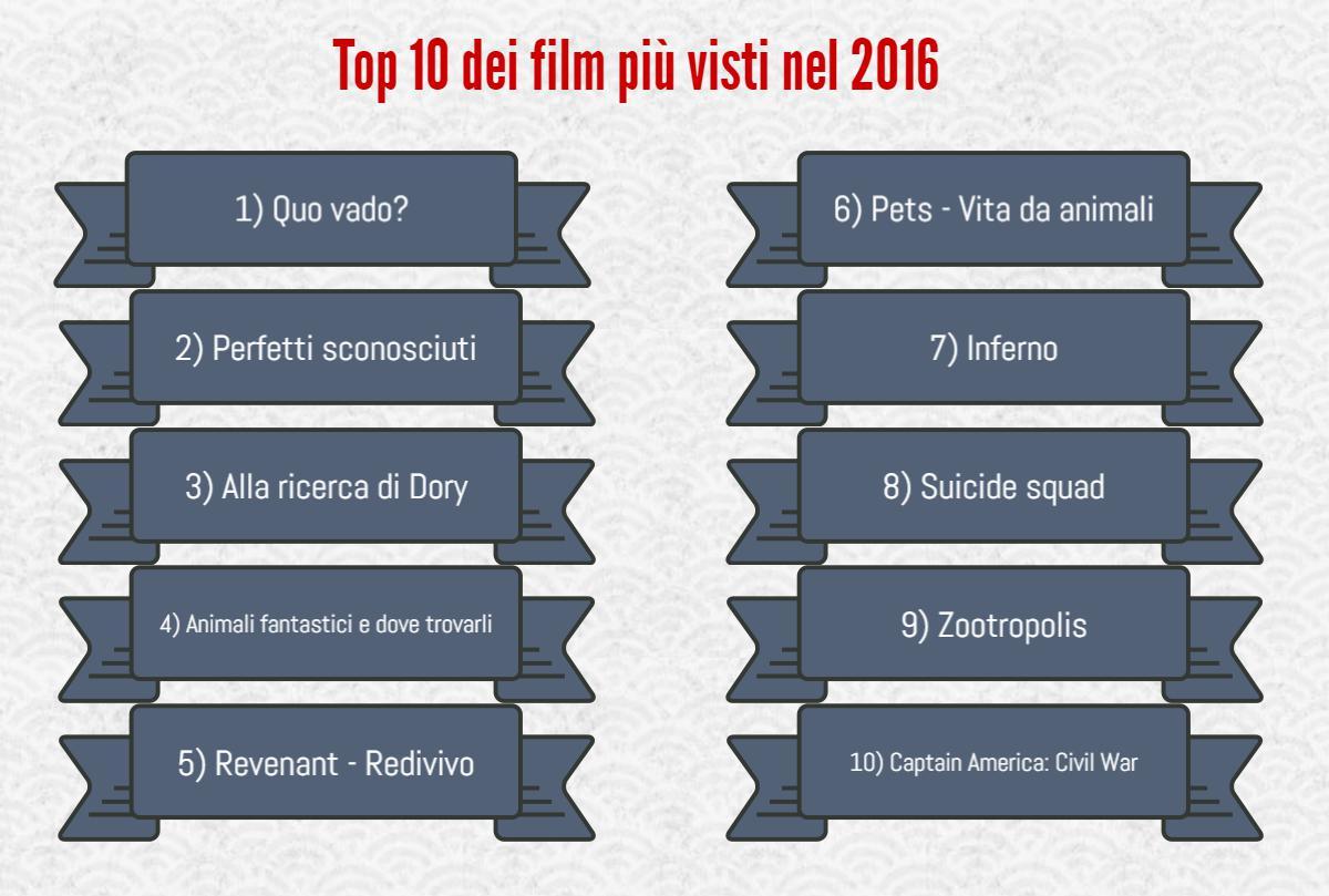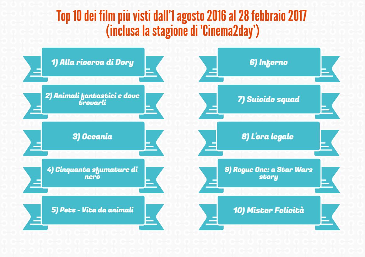 I DATI CINETEL. A gennaio sono stati pubblicati i dati del mercato cinematografico 2016, raccolti da Cinetel, la società che rileva quotidianamente le entrate e le presenze nelle sale italiane. Il box office dello scorso anno, influenzato anche da Cinema2day, ha chiuso in positivo: 105.385.195 i biglietti venduti (con una crescita del 6,06% rispetto al 2015) e 661.844.025 € gli incassi ottenuti (+3,86%). Ma al di là dell’effetto dell’iniziativa in questione, la preoccupazione maggiore delle associazioni consiste nel fatto che, a far raggiungere tali vette, sia stata la presenza di film “d’eccezione” quali i blockbuster americani e Quo vado con Checco Zalone. Un andamento altalenante, quindi, da assestare, mediante un’offerta diversificata e maggiormente distribuita nell’arco dei dodici mesi.