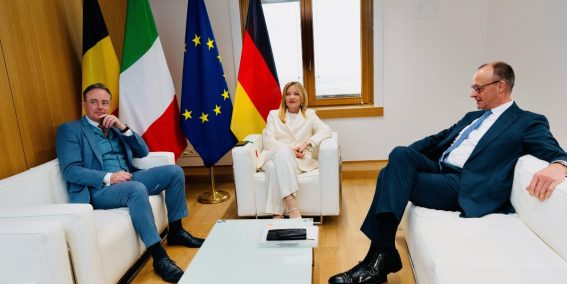 La premier Meloni, il cancelliere tedesco Merz e il primo ministro belga de Wever in un incontro a margine del Consiglio Ue | Foto Ansa