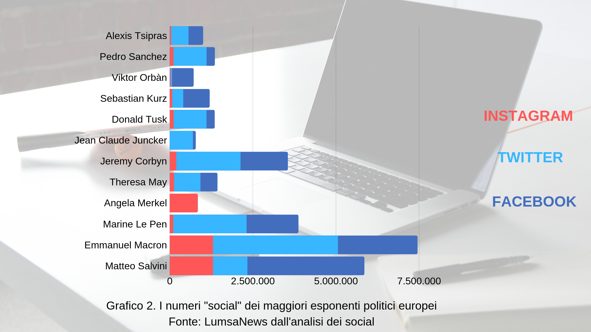 Nel Grafico 2, si può invece notare come, anche a livello europeo, Matteo Salvini non abbia rivali su Facebook e Instagram. Solo Emmanuel Macron, Marine Le Pen, la presidente del Front National, e Jeremy Corbyn, leader laburista, battono il nostro Salvini su Twitter.