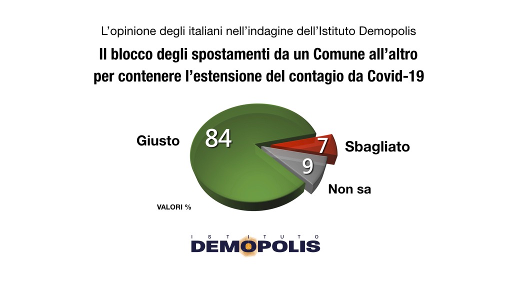 Pietro Vento aggiunge che “si guarda con attenzione alle scelte del Governo e di molte Regioni: il blocco degli spostamenti da un Comune all’altro per contenere l’estensione del contagio è ritenuto giusto dall’84% degli italiani: un valore sorprendente, che conferma la disponibilità ad accettare ulteriori limitazioni pur di uscire presto da quest’emergenza”.
