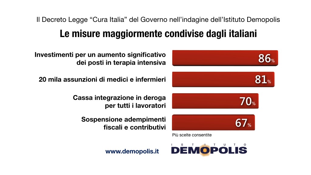 Pietro Vento, il direttore dell’Istituto Demopolis, spiega che “i timori per la tenuta del sistema sanitario prevalgono oggi, nel sentiment dei cittadini, sulle preoccupazioni economiche. La conferma viene dalla graduatoria delle misure del Decreto Legge Cura Italia maggiormente condivise dall’opinione pubblica”. Infatti l’86% approva l’aumento di attrezzature e posti di terapia intensiva; l’81% è a favore della decisione di mirare ad assumere 20mila tra medici e infermieri. Per quanto riguarda le misure economiche invece sette su dieci approvano la cassa integrazione in deroga per tutti i lavoratori, e due su tre la sospensione di adempimenti fiscali e contributivi.