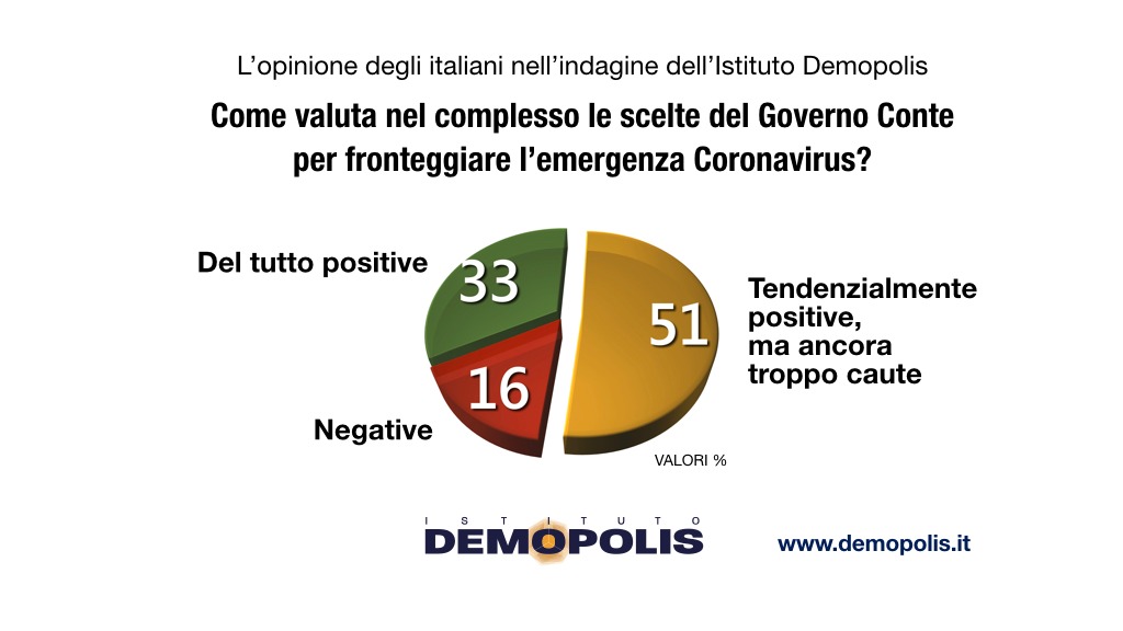 L’indagine è stata realizzata dal 22 al 23 marzo su un campione stratificato di 1.500 intervistati. Emerge che il 33% promuove a pieni voti il Governo, mentre il 51% ritiene che le scelte siano positive, ma ancora blande. Il16% infine esprime un giudizio completamente negativo.