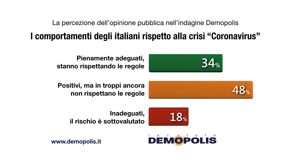 Per quanto riguarda l’invito a stare a casa, invece, poco più di un terzo pensa che i comportamenti siano completamente adeguati. Il 48% (quasi un cittadino su due intervistato da Demopolis per il programma “Otto e Mezzo”) pensa che gli italiani stiano rispondendo in maniera positiva, ma che ancora troppe persone non stanno rispettando le regole. Il 18% ritiene che gli italiani stiamo sottovalutando i rischi e che i comportamenti quindi non sono adeguati.