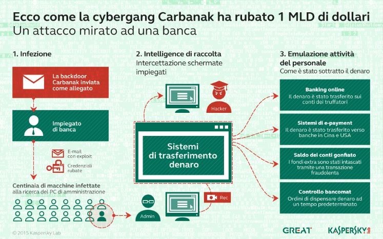 Le banche. Eugene Kaspersky, presidente di Kaspersky Lab, ha però dichiarato solo pochi mesi fa che nei prossimi anni il cybercrime si focalizzerà su «attacchi cross-border mirati alle istituzioni finanziarie, in particolare verso le banche». Hackerare le banche sta diventando redditizio. Nel 2013 gli sportelli bancomat di Kiev iniziarono, apparentemente ad orari casuali, a sputare banconote senza che nessuno avesse ordinato il prelievo. Eppure c’era sempre qualcuno pronto a ritirarle. Dalle indagini dell’azienda russa, conclusesi due anni dopo, si scoprì che il sistema della banca era stato compromesso dal malware Carbanak. La truffa fruttò circa un miliardo di dollari, sottratti con pratiche del genere a 100 banche in tutto il mondo. Il file nocivo veniva inviato sulle mail degli impiegati abilitati come amministratori nei computer bancari: bastava scaricarlo una volta, che il virus infettava il pc, diffondendosi poi sugli altri ad esso collegati. Gli hacker potevano così spiare le abitudini degli impiegati, per poi simularne i comportamenti ed effettuare operazioni in libertà. La vulnerabilità dei sistemi bancari preoccupa anche l’UE. Già da tempo la Banca Centrale Europea spinge affinché vengano predisposti protocolli di emergenza in grado di far lavorare le banche per un certo lasso di tempo anche in caso di compromissione del sistema.