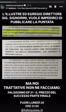 Sul fronte giudiziario, Corona deve affrontare anche un’indagine nata dalla denuncia di Mediaset per diffamazione e minacce, accompagnata dalla richiesta di limitarne l’uso dei social. A livello penale è inoltre indagato per revenge porn dopo l’esposto di Signorini. Quest’ultimo, a sua volta, risulta indagato per violenza sessuale ed estorsione su querela di Antonio Medugno, ex concorrente del Grande Fratello Vip. Corona parla di “nuovo editto bulgaro”, denunciando un tentativo di silenziarlo.
