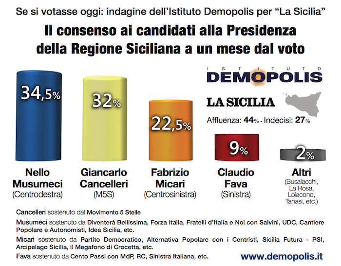 Secondo il sondaggio Demopolis, realizzato per il quotidiano “La Sicilia”, Nello Musumeci, con il 34,5%, è oggi in vantaggio di due punti e mezzo su Giancarlo Cancelleri, candidato del Movimento 5 stelle, attestato al 32%. Resta indietro il rettore Fabrizio Micari, esponente del centrosinistra con il 22,5%, più staccato Fava al 9%. Dati che ribaltano completamente quelli dei sondaggi precedenti, che invece davano Cancelleri per favorito.