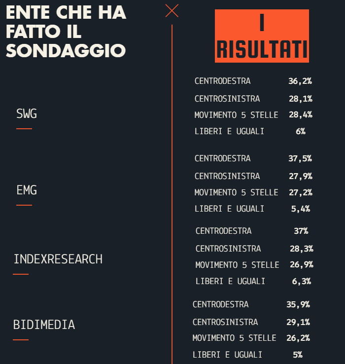E’ iniziato il conto alla rovescia per le elezioni politiche. Con gli ultimi sondaggi gli istituti demoscopici hanno cercato di rappresentare le intenzioni degli italiani. Come previsto dall’Agcom, nei quindici giorni prima del voto non sarà possibile pubblicare indagini e statistiche. A tal proposito i partiti sfrutteranno le loro ultime armi per ribaltare lo scenario. Ma dalle ricerche emergono tendenze e percentuali più o meno stabili. Al momento, quindi, gli ultimi fatti di attualità, a partire da Macerata, non sembrano influenzare le scelte degli italiani.