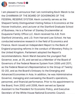 WASHINGTON – Sarà Kevin M. Warsh, ex funzionario della Fed, il successore di Jerome Powell alla presidenza della Fed. Ad annunciarlo lo stesso presidente Donald Trump in un post su Truth.