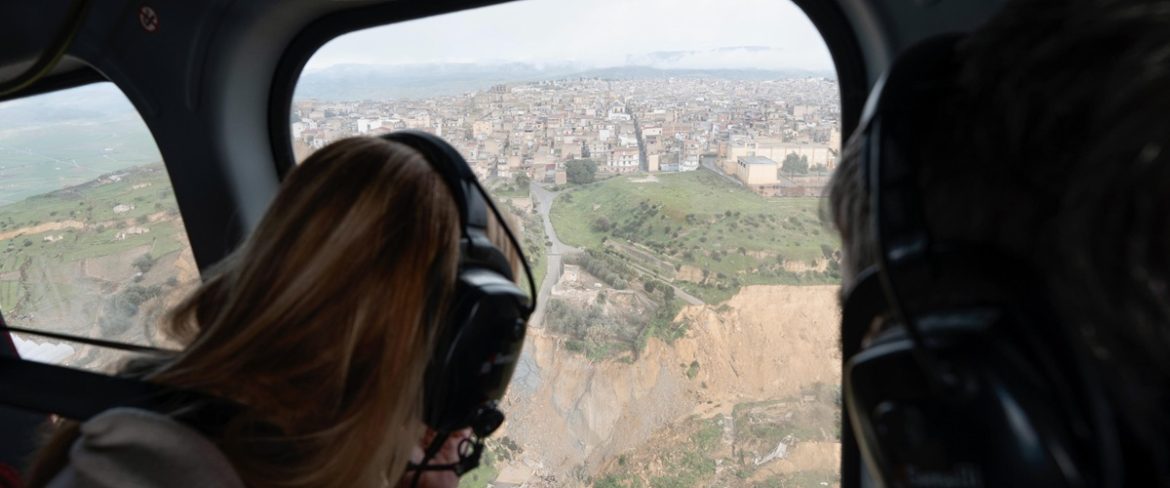 La premier Giorgia Meloni durante il sorvolo in elicottero sulle zone colpite dal maltempo in Sicialia, Niscemi, 28 gennaio 2026 | Foto Ansa