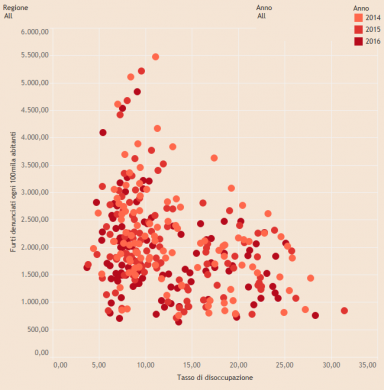 Dall’infografica risulta quindi che il maggior numero di furti nel triennio preso in considerazione li ha subiti la provincia di Rimini nel 2014: dai dati comunicati, risultarono ben 18.328 ladrocini denunciati, con una media di 5.467,80 furti ogni 100.000 abitanti. Il tutto a fronte di un tasso di disoccupazione del 11,08%. Sul fondo delle provincie meno “criminali” d’Italia Sondrio, in Lombardia, che ha registrato nel 2016 1.264 furti, quasi 697 ogni 100.000 abitanti e con un tasso di disoccupazione del 7,21%.