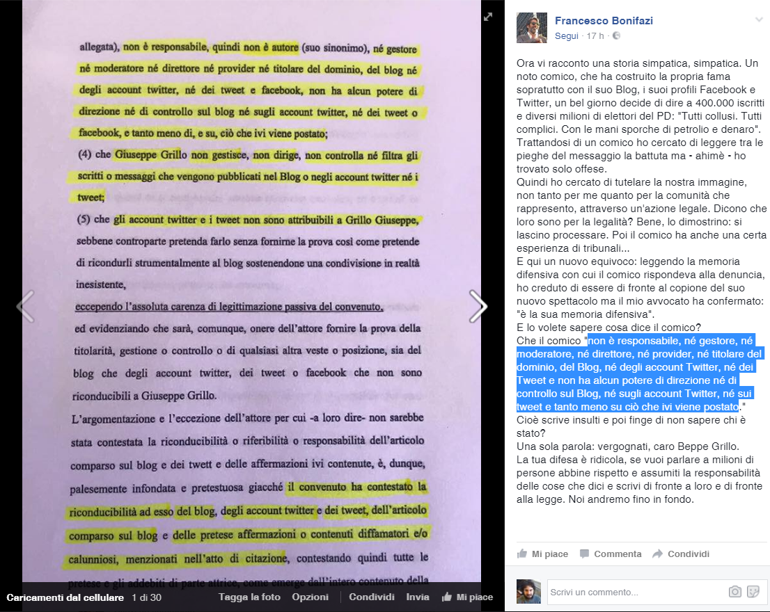 Ciò che ha scatenato una certa perplessità è però la memoria difensiva di Grillo contro la denuncia del Pd, pubblicata da Bonifazi nel suo post odierno.