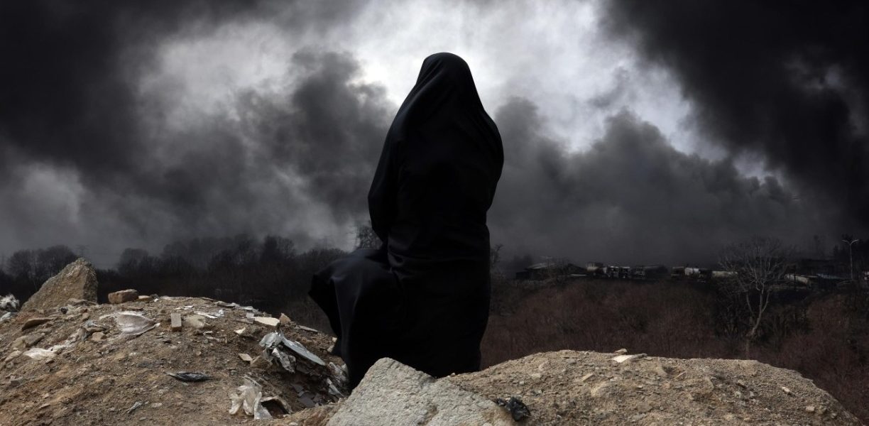 Una donna iraniana, membro della Mezzaluna Rossa, osserva il fumo che si alza dopo un attacco israelo-americano su Teheran | Foto Ansa