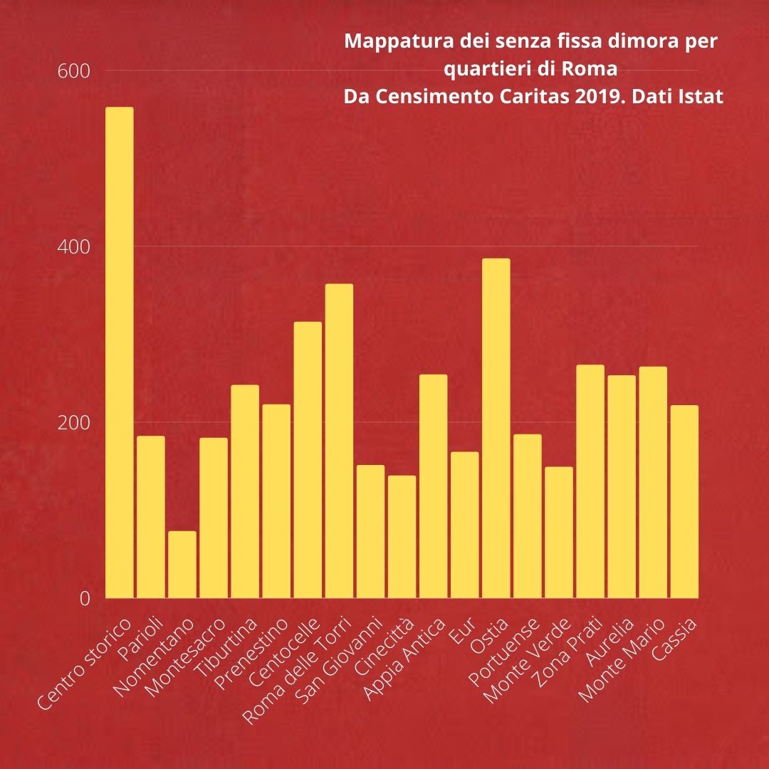 Dal censimento Caritas risulta che sono circa 7.709 le persone senza fissa dimora a Roma, pari al 15,2% del dato complessivo italiano e alla quasi totalità della popolazione di senzatetto del Lazio. Secondo i dati pre pandemici gli alloggi improvvisati in cui vivono gli homeless sono circa 4.564, la maggior parte dei quali concentrati nella zona del centro storico (circa 558 tra tende, camper, baracche). Fanalino di coda è il Nomentano con appena 76 abitazioni di fortuna.