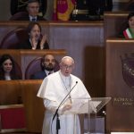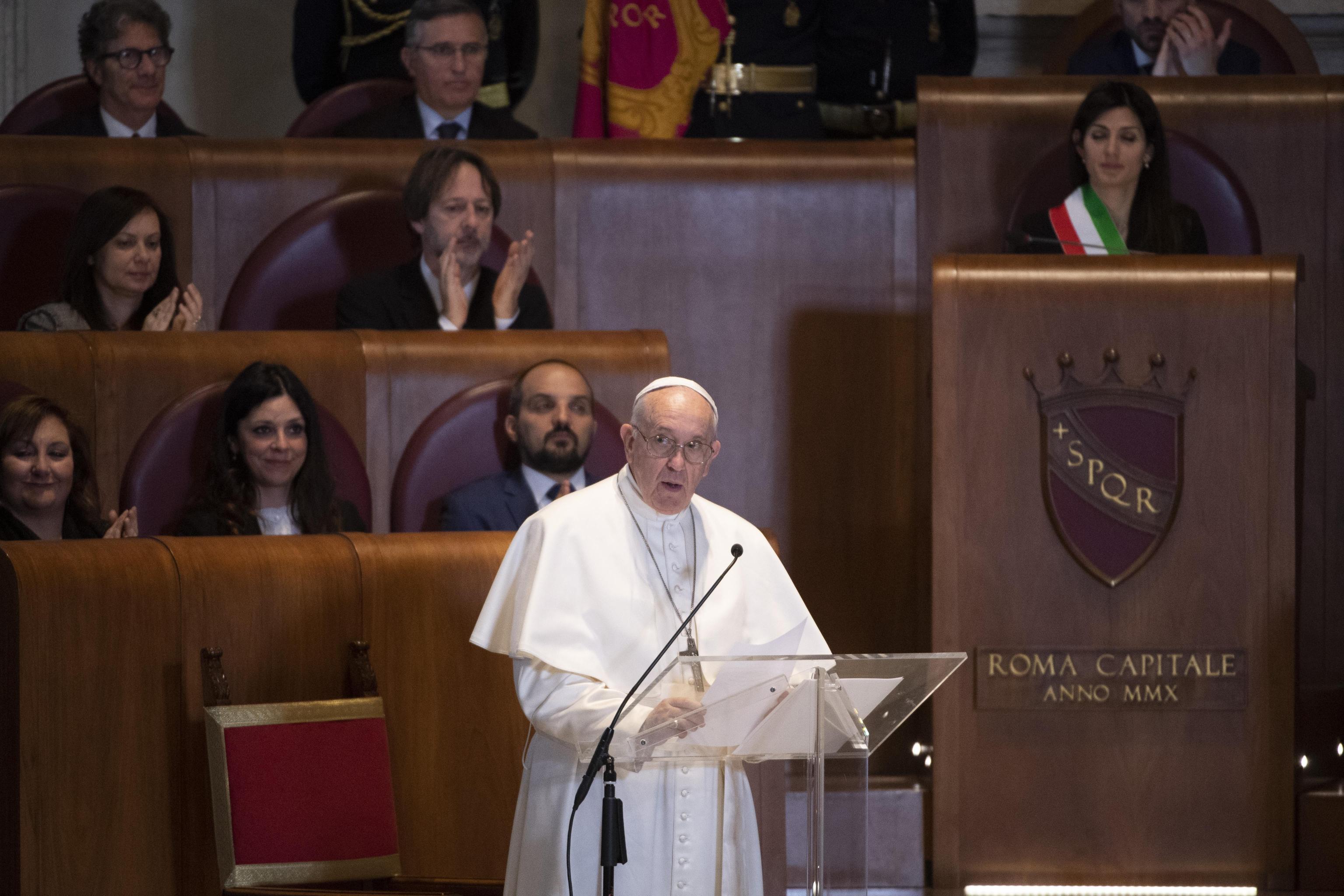 “Roma possiede una vocazione universale”, sono le parole di Papa Francesco dopo esserci affacciato insieme alla sindaca Virginia Raggi dal balcone del Campidoglio che dà sui Fori Romani. Ma “ancora più decisivo – ha aggiunto il Pontefice – è che Roma si mantenga all’altezza dei suoi compiti e della sua storia, che sappia anche nelle mutate circostanze odierne essere faro di civiltà e maestra di accoglienza”.