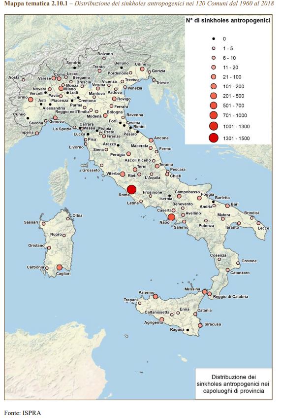 Un’ulteriore ricerca statistica ha invece sottolineato la presenza di voragini nelle stesse città. La maglia nera, in questo caso specifico, spetta a Roma, che dal 1960 a ottobre del 2018, come riportato nel rapporto e come si può evincere dalla mappa sottostante, presenta 1325 “sinkholes”, nome tecnico con cui si indicano i fenomeni di sprofondamento del suolo indotti dalle attività umane. Al secondo posto c’è Napoli, con 648 voragini; sul podio anche Cagliari, che ne presenta 131. Il fenomeno è caratteristico del Sud Italia e interessa solo in parte la zona settentrionale della penisola. La prima città del Nord che troviamo nella classifica è Torino con 25 sprofondamenti. I rilevamenti per queste ultime città si sono fermati ad agosto 2018.