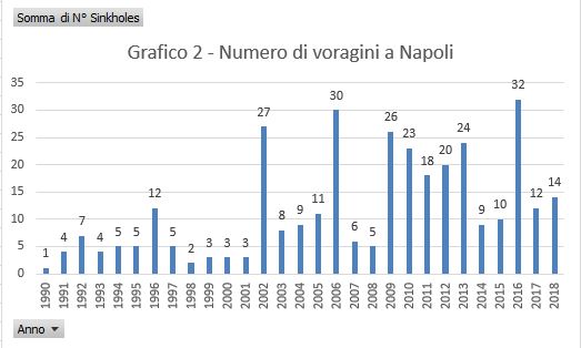 A Napoli, nel 2018 le voragini sono state 14, meno della metà rispetto al picco del 2016 (32). Le cause sono da riscontrare prevalentemente nelle forti piogge, nelle perdite delle reti idriche o nell’infiltrazione delle acque meteoriche. Le zone più colpite sono quelle del centro storico e causano a loro volta crolli di abitazioni civili e danni alle infrastrutture (Grafico 2).