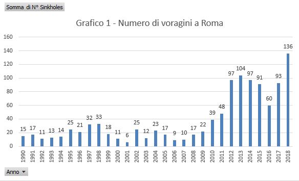 Sull’argomento, l’Ispra ha effettuato un approfondimento sulla situazione di Roma e Napoli, cercando di capire non solo le zone delle due città maggiormente interessate, ma anche l’origine di questi fenomeni. A Roma, che ha registrato 136 casi di voragini in un solo anno, l’origine è dovuta a delle cavità sotterranee che presentano una fitta rete di gallerie e cunicoli che mettono in pericolo la sicurezza della città. Le aree a maggiore rischio sono Tuscolano, Prenestino, Centocelle, Appia Antica e Tiburtino, seguite da San Giovanni Labicano e la zona della Flaminia Cassia (Grafico 1).
