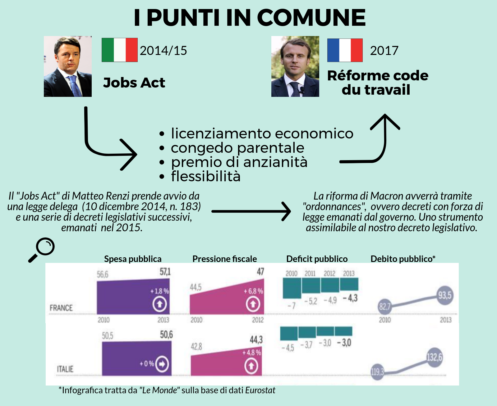 Ma “il riformismo liberale che Macron sta tentando di portare avanti in Francia si ispira molto al piglio decisionista che si è visto in Italia con Matteo Renzi” ci spiega Mauro Zanon, autore del libro ‘Macron. La rivoluzione liberale francese’. E aggiunge: “Non si sbaglia quando si dice che la nuova riforma del lavoro è un Jobs act alla francese”. Ancora, sarebbe anche in cantiere un “pass culture” per i giovani, simile al bonus di 500 euro per i diciottenni proposto in Italia dal segretario Pd.