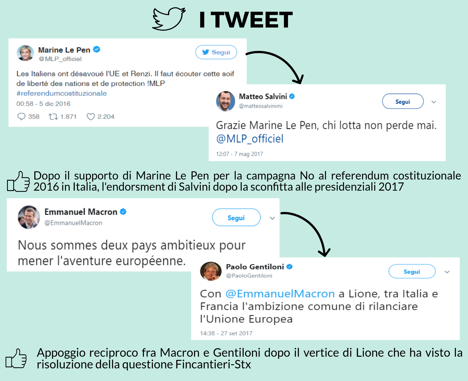 In Italia, “il centro destra è uno schieramento al bivio fra il populismo securitario leghista di Matteo Salvini e il liberalismo parecchio azzoppato dopo vent’anni di fallimenti berlusconiani” scrive il giornalista Davide Allegranti nel suo ultimo libro “Matteo Le Pen”, confrontando come comunicano le destre francesi e italiane. “Mi piacciono diverse cose sia del M5s che della Lega Nord, peccato che non vogliano allearsi” specifica invece a Lumsanews Aymeric Durox, segretario del Front National nel dipartimento Seine et Marne. In riferimento al panorama italiano, aggiunge: “Ho visto anche il sito di Casa Pound e trovo che sia ricco di spunti”.
