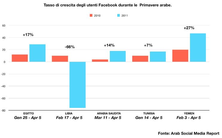 Alla fine del 2010 nel mondo arabo Facebook contava 21.361.830 milioni di utenti. Quasi l’80% in più rispetto all’anno precedente (11.978.300, secondo i dati dell’Arab Social Media Report). Quali sono le ragioni di un incremento così esponenziale? In due parole: Primavere Arabe, non a caso ribattezzate “rivoluzioni di Internet”.
