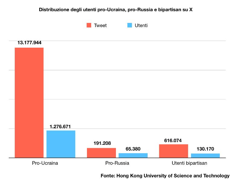 Su Facebook e Twitter, ad esempio, la segregazione all’interno di echo chambers è dominante, come spiega Walter Quattrociocchi, professore al dipartimento di informatica dell’università La Sapienza di Roma. Dai vaccini contro il Covid alle presidenziali americane, esistono camere d’eco per qualsiasi argomento, anche la guerra. E operano in modo estremamente divisivo. Prendiamo in esame uno studio dell’Università di Hong Kong condotto su X nell’ambito del conflitto russo-ucraino.