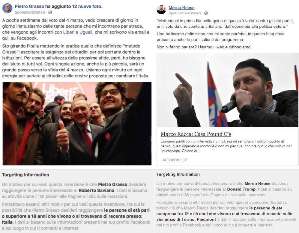 Più sottile invece il tentativo di captare l’attenzione di chi segue un personaggio o una pagina che il partito che fa l’inserzione considera a sé vicino. Ad esempio, interessante il caso di Pietro Grasso, leader di Liberi e Uguali, che indirizza i propri post a chi segue Roberto Saviano. Come anche quello del candidato di Casapound Italia Marco Racca, che cerca invece di raggiungere i fan di Donald Trump.
