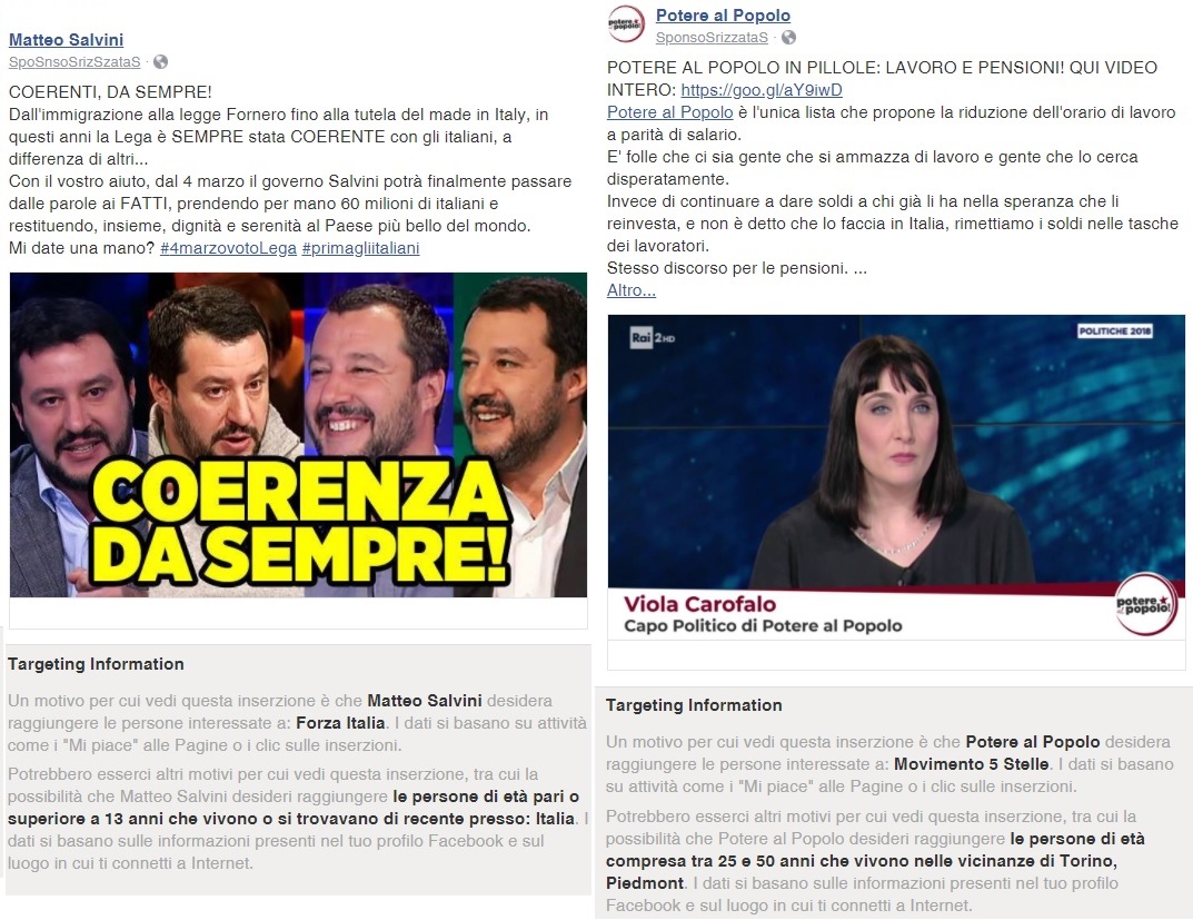 Sul sito del progetto è possibile trovare casi di marketing ancora più curiosi. È il caso dei post che provano a raggiungere seguaci di movimenti politici concorrenti. Salvini cerca di attrarre gli elettori di Forza Italia, presumibilmente per cercare di arrivare primo nella lista di centrodestra. Potere al Popolo si rivolge invece a chi segue il Movimento 5 Stelle.