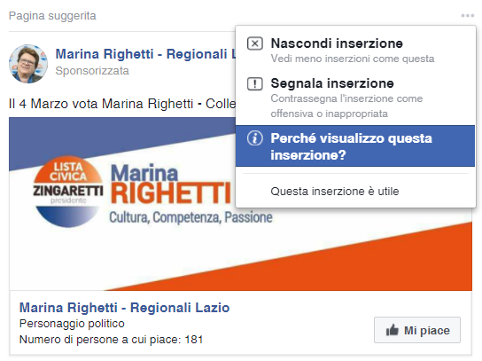 È facile scoprire quali sono gli obiettivi di marketing di un post Facebook. Quando vediamo un post sponsorizzato, basta cliccare sui tre puntini che vediamo in alto a destra e poi selezionare la voce “Perchè visualizzo questa inserzione?”.