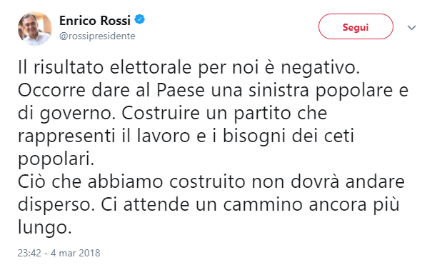 La notte elettorale – I minuti dopo le 23:00 al comitato elettorale di Trastevere, a Roma, sono stati infiniti. I primi istant poll che attestavano LeU fra il 4-6% hanno subito cominciato una picchiata in discesa fino alla stabilità delle proiezioni sul 3,3%.  Al punto che nessun candidato si presenta alla sede. L’unico che ci mette la faccia alle due di notte è Nico Stumpo, candidato alla Camera nel collegio di Catanzaro, che ritiene i risultati “al di sotto delle nostre aspettative” e avverte “quando ci saranno i dati definitivi faremo le nostre valutazioni politiche”. Poche parole, come quelle di Enrico Rossi, presidente della Regione Toscana ed esponente di LeU. “Il risultato elettorale è per noi negativo, ma ciò che abbiamo costruito non dovrà andare disperso” scrive sul social network.