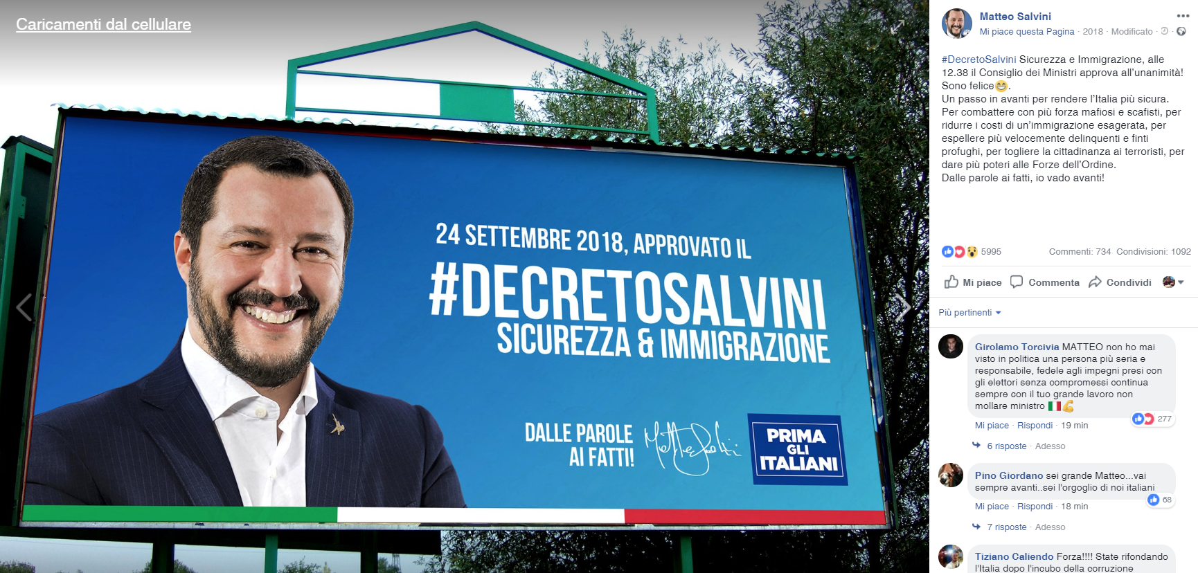Via libera del Consiglio dei ministri al decreto che ha unificato i precedenti testi su sicurezza e migranti. Il voto è arrivato nella tarda mattinata di oggi, all’unanimità. “Sono felice. Un passo in avanti per rendere l’Italia più sicura”. scrive il ministro dell’Interno, Matteo Salvini, su Facebook.