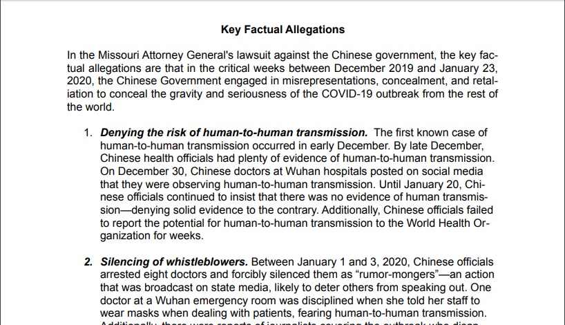 Il Missouri è il primo stato americano che ha fatto causa alla Cina per i danni del Coronavirus. “Il governo cinese si è impegnato in false dichiarazioni, occultamento e ritorsioni per nascondere la gravità e la gravità dell’epidemia di Covid-19 al resto del mondo”, spiega il documento. In particolare, secondo lo stato nord americano c’è stata la negazione della trasmissione del virus da uomo a uomo, l’arresto degli informatori anonimi come medici e giornalisti, il fallimento nel contenere il virus e persino l’accumulazione dei dispositivi di protezione individuale, causando così una pandemia globale che non era necessaria ed era prevenibile. La denuncia è partita dal procuratore generale del Missouri Eric Schmitt, repubblicano così come il suo governatore.