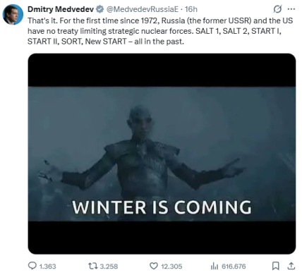 Il portavoce del Cremlino Dmitry Peskov esprime “rammarico” per la scadenza dell’intesa. Ma a lanciare l’allarme è anche il vicepresidente del Consiglio di sicurezza russo Dmitry Medvedev, che in un post su X scrive: “Ecco fatto. Per la prima volta dal 1972, la Russia – ex Urss – e gli Stati Uniti non hanno un trattato che limiti le forze nucleari strategiche”. L’ex presidente della Federazione Russa, poi, ricorda gli altri accordi sulla deterrenza nucleare siglati con gli Usa: “Tutto questo appartiene al passato”. Medvedev, poi, aggiunge uno screenshot della serie tv Game of Thrones che recita “winter is coming” (l’inverno sta arrivando, ndr).