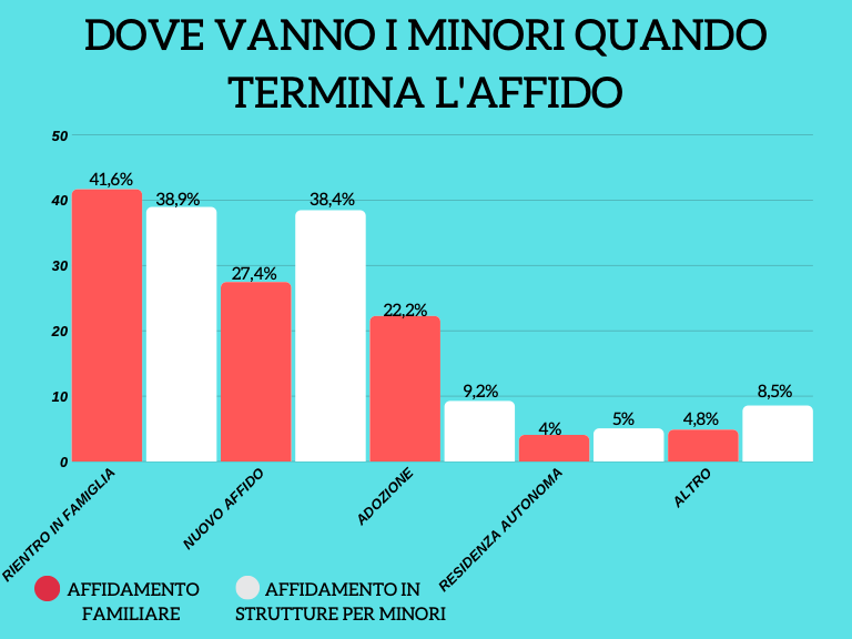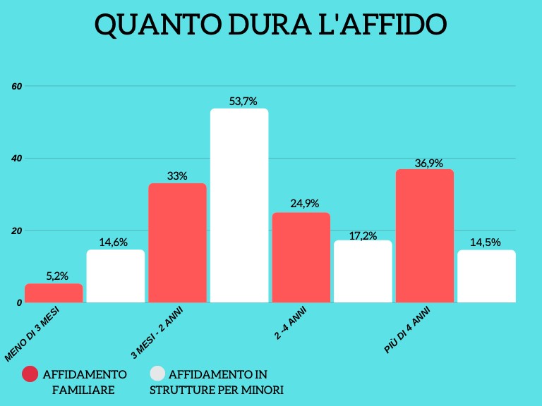 Sui 26 615 minori in affidamento censiti in Italia per l’anno 2016, 14 012 risiedono presso famiglie, mentre i restanti 12 603 sono dislocati in strutture per l’affido. La legge sugli affidamenti indica ai tribunali di preferire come destinazione finale per i minori sistemazioni intrafamiliari, per cercare di preservare la socialità familiare anche in caso di affido.