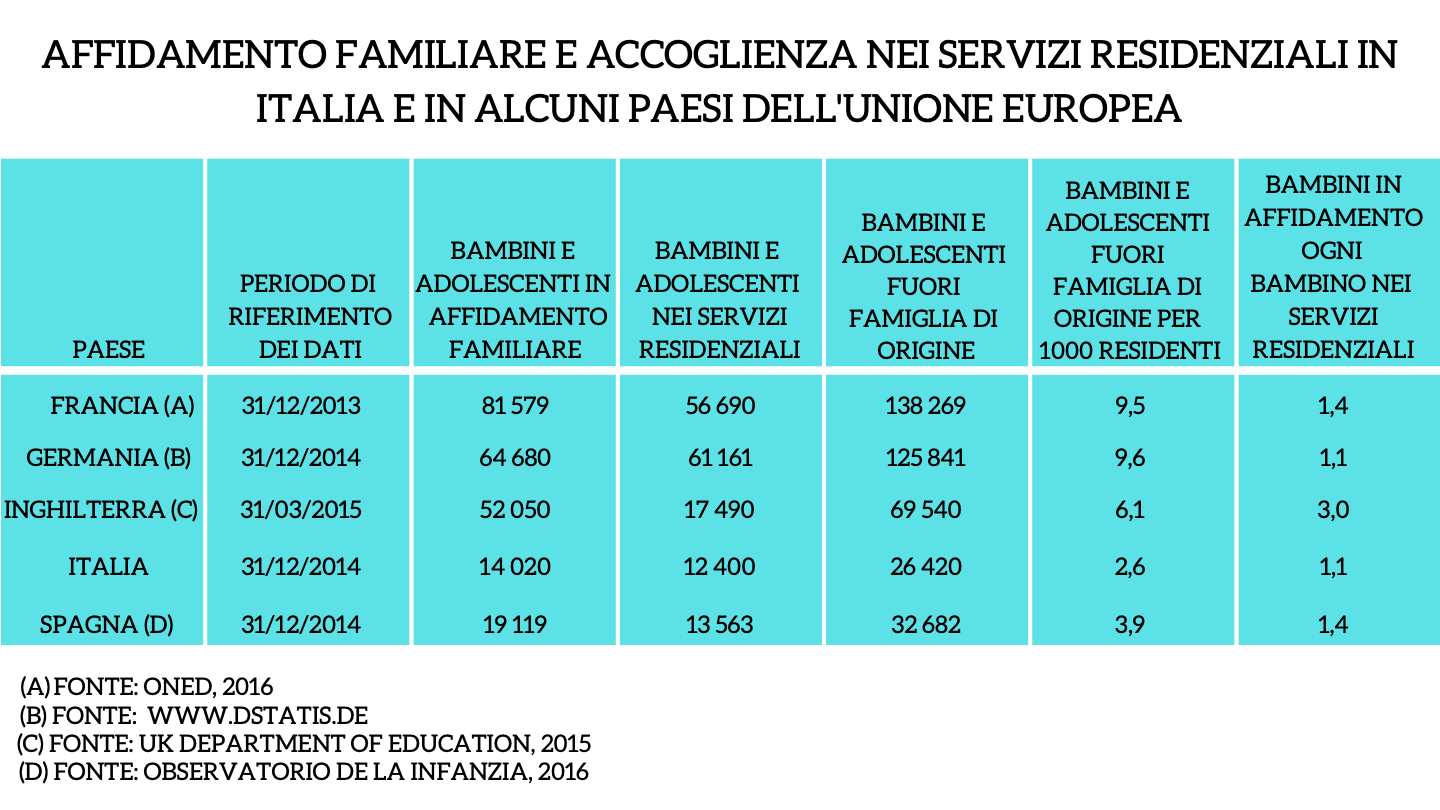 I fatti di Bibbiano hanno evidentemente veicolato una decisa attenzione verso il sistema degli affidamenti dei minori in Italia, come evidenziato dalle due proposte di legge. Se è vero che dalle indagini sulla vicenda Bibbiano e da precedenti inchieste in Emilia Romagna sarebbero emerse criticità del sistema, è necessario sottolineare che questo istituto in Italia è tutt’altro che abusato rispetto agli altri principali Paesi europei, come dimostrano i dati presenti nella relazione sullo stato di attuazione della legge sull’affidamento dei minori n. 149 del 28 marzo 2001, elaborata dal Ministero della Giustizia e dal Ministero del Lavoro e delle Politiche sociali relativamente al biennio 2014-2015: