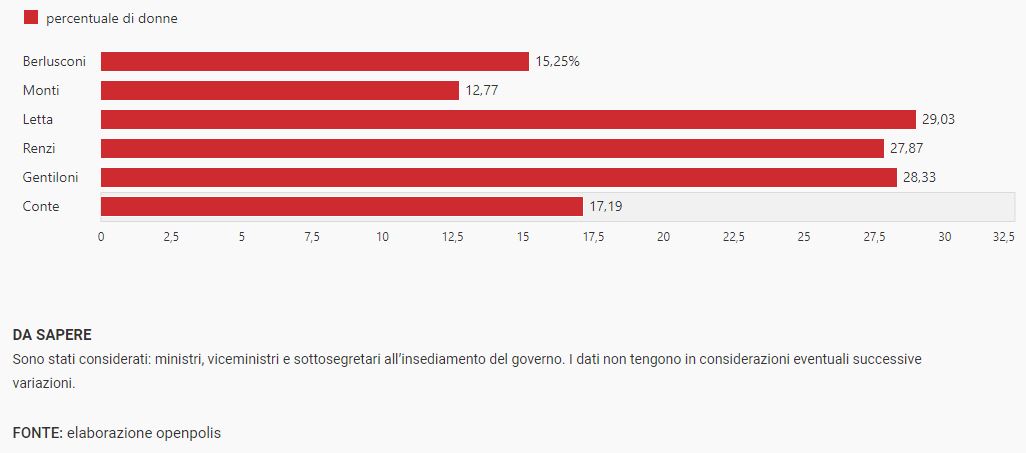 Grazie alle percentuali possiamo sapere che solo il 14% dei sindaci italiani sono di sesso femminile, mentre 2 delle 21 tra regioni e province autonome sono guidate da donne. Anche nell’attuale governo la situazione è simile. Considerando anche i sottosegretari e i viceministri, gli uomini rappresentano oltre l’80% dell’esecutivo. Il dato è il più basso dal governo Letta, picco più alto degli ultimi anni, quando comunque le donne erano meno del 30%.