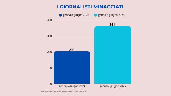 In questo contesto, si aggiungono le sempre più diffuse intimidazioni ai giornalisti, così come le querele temerarie. Dall’attentato al conduttore di Report Sigfrido Ranucci all’assalto degli antagonisti pro-Pal a La Stampa, la libertà di espressione è sotto attacco. Secondo i dati del report annuale di Ossigeno per l’informazione, l’osservatorio che monitora gli abusi subiti dai giornalisti, nei primi sei mesi di quest’anno le minacce ai giornalisti sono aumentate del 78% rispetto allo stesso periodo del 2024. Lo conferma il presidente dello stesso osservatorio Alberto Spampinato: “Abbiamo rilevato 361 giornalisti minacciati”. Il primo semestre dello scorso anno erano 203. Ma la cifra reale è molto più alta se si contano anche “le 10 mila querele pretestuose e intimidatorie presentate ogni anno in Italia”.