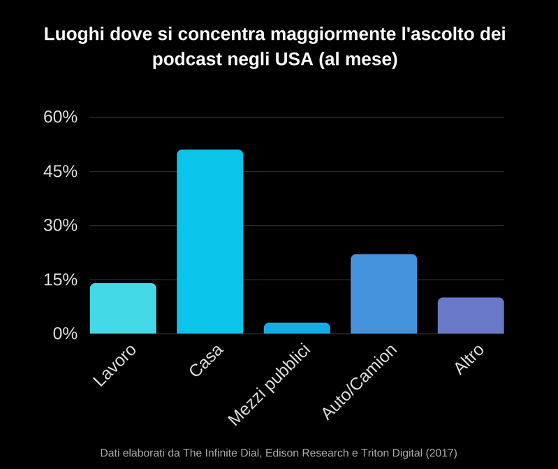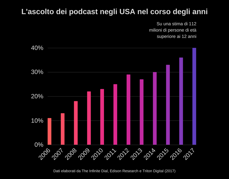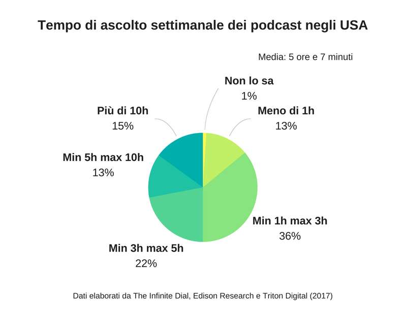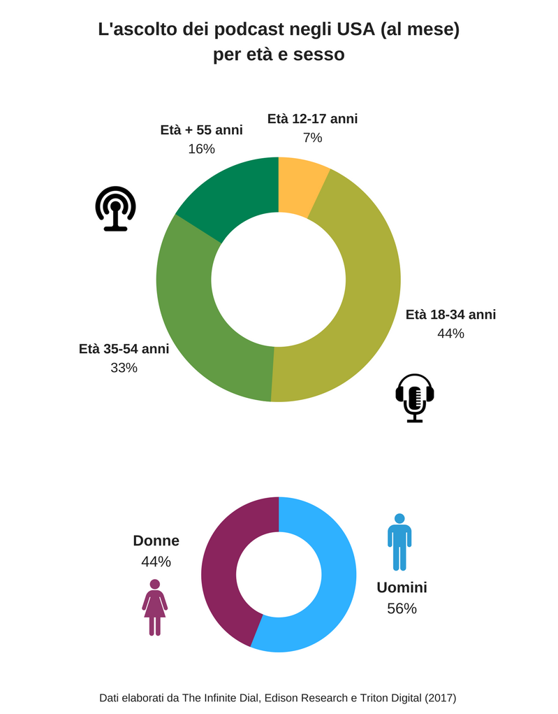 I NUMERI. Dal 2006 – anno a cui risalgono i primi rilevamenti di Edison Research, The Infinite Dial e Triton Digital – al 2017, è stata registrata una crescita del 29% per quanto riguarda l’ascolto dei podcast. Lo studio è stato condotto su un campione di 112 milioni di persone statunitensi, di età superiore ai 12 anni. Il 56% degli ascoltatori è di sesso maschile, il 44% femminile. L’81% ascolta podcast via smartphone, tablet e dispositivi mobili, mentre solo il 19% tramite computer. Dalla ricerca si evince anche che il tipo di impiego condiziona l’ascolto: a dedicare più tempo sono coloro che hanno un lavoro a tempo pieno (49%) e i pensionati (21%), seguiti dagli occupati part-time (11%), casalinghe e studenti maggiorenni (entrambi al 6%) e infine i disoccupati al 5%.