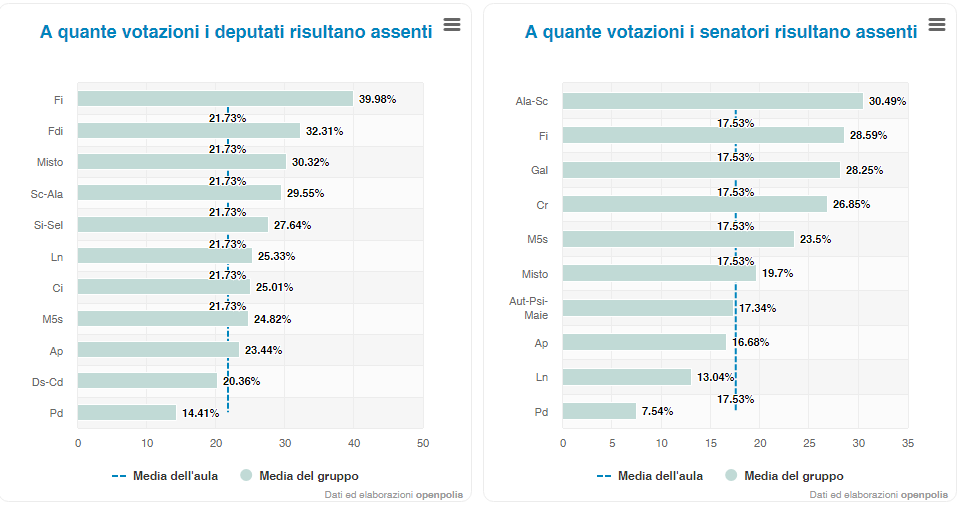 Missioni parlamentari. La situazione si complica aggiungendo le cosiddette “assenze giustificate”. Alle votazioni in aula infatti, un parlamentare può risultare non solo presente o assente, ma anche in missione. In quest’ultimo caso il politico non può partecipare in quanto impegnato in compiti istituzionali. La dicitura “in missione” però, è circondata da ben poca trasparenza, in quanto non viene specificata l’attività esatta e la sua durata. La confusione è aumentata dal fatto che i congedi sono segnati senza distinzione dalle missioni. Risulta quasi impossibile un controllo preciso se si considera che per di più, anche in congedo o missione i parlamentari possono partecipare formalmente ai voti più importanti. Nella XVII legislatura i deputati sono risultati in missione nell’11% delle votazioni elettroniche. I gruppi con la media più alta sono risultati essere Area popolare, Fratelli d’Italia e Democrazia solidale – Centro democratico. Una media leggermente inferiore al Senato con l’8,74%, con in cima alla lista Aut-Psi-Maie, Area popolare e Lega Nord.