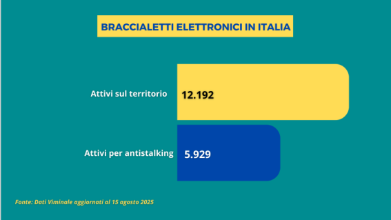 Secondo i dati del Viminale aggiornati al 15 agosto 2025 sono 12.192 i braccialetti elettronici attualmente in uso in Italia. Di questi, 5.529 sono stati attivati a seguito di denunce per stalking. Il dispositivo si compone di due parti, un braccialetto da applicare alla caviglia dell’accusato e uno smartphone da consegnare alla vittima.