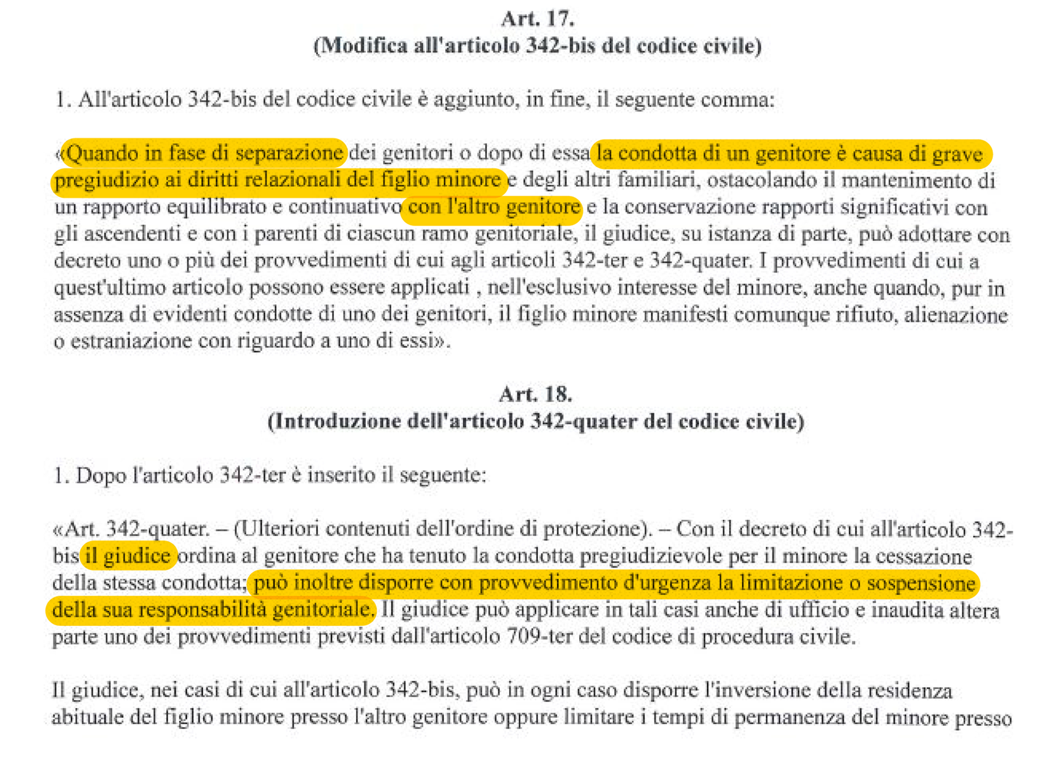 Secondo i movimenti femministi e le associazioni contro la violenza sulle donne però questo disegno di legge non prende in esame, in modo soddisfacente, i contesti di violenza (menzionati all’articolo 17 e 18). «Se allontano mio figlio da un contesto violento posso perdere la responsabilità genitoriale» afferma la Gentili. Secondo molte associazioni e centri anti-violenza, la previsione della sospensione e la decadenza della responsabilità genitoriale in caso di accuse non accertate giudizialmente rappresenta una minaccia per le donne fondata sul pregiudizio che queste denuncino maltrattamenti, o altre forme di violenza, per trarne vantaggio e ottenere l’affidamento dei minori.
