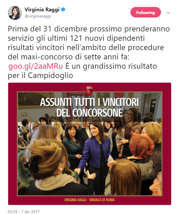 Entro l’anno si procederà all’assunzione di tutti i vincitori del cosiddetto “concorsone”; lo comunica in una nota il Campidoglio. Prima della fine del 2017 prenderanno quindi servizio gli ultimi 121 nuovi dipendenti risultati vincitori nell’ambito delle procedure del maxi-concorso del 2010. “Si tratta di un grandissimo risultato – dichiara la sindaca di Roma Virginia Raggi – perché dopo sette anni viene finalmente premiato il merito e riconosciuto il diritto di chi da troppo tempo attendeva di essere assunto in Campidoglio”.