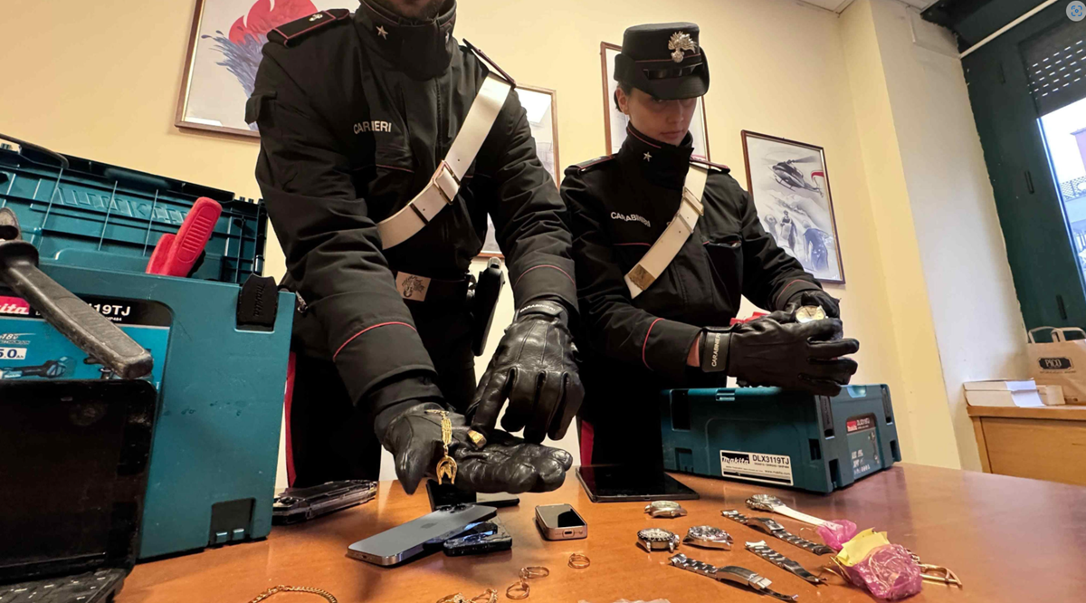 I carabinieri mostrano la refurtiva recuperata nel maxi blitz che ha portato a 18 arresti nei confronti di un gruppo criminale, i cui componenti gravitavano presso il campo nomadi di via dei Gordiani | Foto Ansa