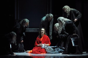 L’attrice conserva quell’ardore disperato sino al suo ultimo momento, quando appare stretta allo scheletro del fratello come se abbracciasse il suo destino. Le ossa bianche e pulitissime sono le protagoniste silenti dello spettacolo di Tiezzi. Messi in posa, trascinati, adagiati sulla nuda terra, gli scheletri duettano con gli attori in una danza macabra che erge la morte a supremo giudice.